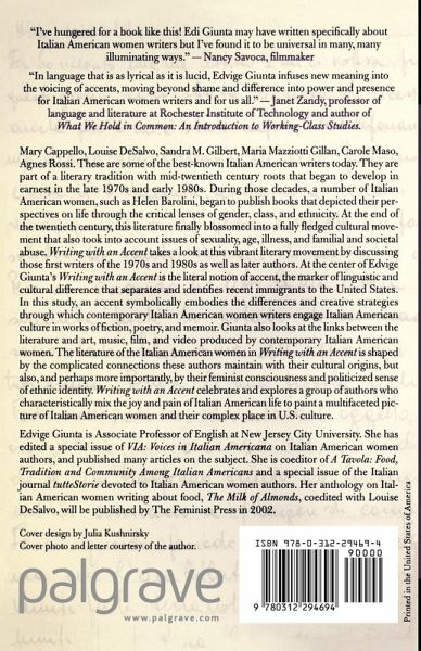 "In language that is as lyrical as it is lucid, Edvige Giunta infuses new meaning into the voicing of accents, moving beyond shame and difference into power and presence for Italian American women writers and for us all." - Janet Zandy, Rochester Institute of Technology