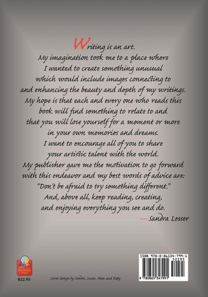 Writing is an art. My imagination took me to a place where I wanted to create something unusual which would include images connecting to and enhancing the beauty and depth of my writings. My hope is that each and every one who reads this book will find something to relate to and that you will lose yourself for a moment or more in your own memories and dreams. I want to encourage all of you to share your artistic talent with the world. My publisher gave me the motivation to go forward with this endeavor and my best words of advice are: "Don't be afraid to try something different." And, above all, keep reading, creating, and enjoying everything you see and do.