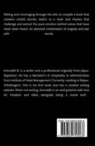 Risking and rummaging through the attic to compile a book that contains untold secrets, letters to a lover and rhymes that challenge and extract the pure emotion behind voices that have never been heard. An absolute combination of tragedy and war with words.