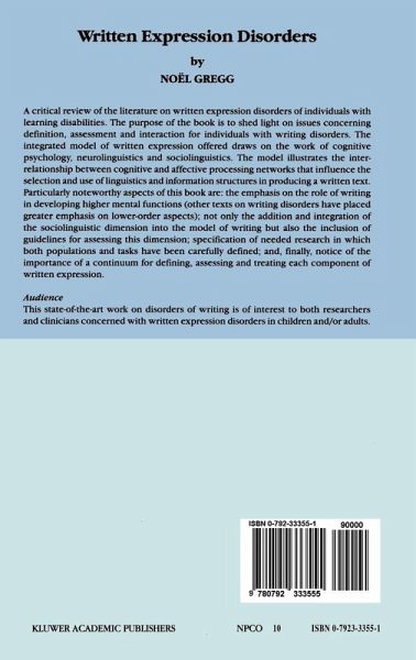 A critical review of the literature on written expression disorders of individuals with learning disabilities. The purpose of the book is to shed light on issues concerning definition, assessment and interaction for individuals with writing disorders. The integrated model of written expression offered draws on the work of cognitive psychology, neurolinguistics and sociolinguistics. The model illustrates the interrelationship between cognitive and affective processing networks that influence the selection and use of linguistics and information structures in producing a written text.