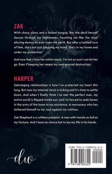 Zak With sharp claws and a forked tongue, the she-devil herself dances through my nightmares, haunting me like the most alluring demon to ever roam the earth. But after a twisted turn of fate, she's not just plaguing my mind. She's in my home and under my protection. And now that I have her within reach, I'm not so sure I can let her go. Even if keeping her means my own assured destruction. Harper Sabotaging relationships is how I've protected my heart this long. But now my internal clock is ticking and it's time to settle down. And when I finally think I've met the perfect man, my entire world is flipped inside out, and I'm forced to seek haven in the arms of the bane to my existence. A mercenary who has tethered himself to my soul against my volition. Zak Shephard is a ruthless predator. A man with morals as dull as my fortune. And I have no choice but to lay my life in his hands.
