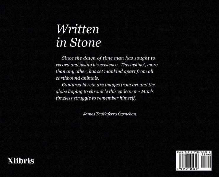 Written in Stone Since the dawn of time man has sought to record and justify his existence. This instinct, more than any other, has set mankind apart from all earthbound animals. Captured herein are images from around the world hoping to chronicle this endeavor - Man's timeless struggle to remember himself. James Tagliaferro Carnehan