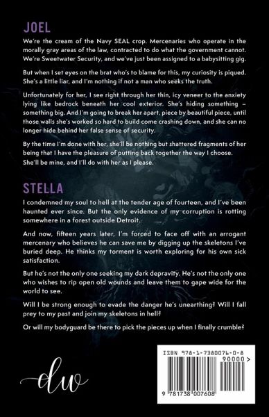 JOEL We're the cream of the Navy SEAL crop. Mercenaries who operate in the morally gray areas of the law, contracted to do what the government cannot. We're Sweetwater Security, and we've just been assigned to a babysitting gig. But when I set eyes on the brat who's to blame for this, my curiosity is piqued. She's a little liar, and I'm nothing if not a man who seeks the truth. Unfortunately for her, I see right through her thin, icy veneer to the anxiety lying like bedrock beneath her cool exterior. She's hiding something - something big. And I'm going to break her apart, piece by beautiful piece, until those walls she's worked so hard to build come crashing down, and she can no longer hide behind her false sense of security. By the time I'm done with her, she'll be nothing but shattered fragments of her being that I have the pleasure of putting back together the way I choose. She'll be mine, and I'll do with her as I please. STELLA I condemned my soul to hell at the tender age of fourteen, and I've been haunted ever since. But the only evidence of my corruption is rotting somewhere in a forest outside Detroit. And now, fifteen years later, I'm forced to face off with an arrogant mercenary who believes he can save me by digging up the skeletons I've buried deep. He thinks my torment is worth exploring for his own sick satisfaction. But he's not the only one seeking my dark depravity. He's not the only one who wishes to rip open old wounds and leave them to gape wide for the world to see. Will I be strong enough to evade the danger he's unearthing? Will I fall prey to my past and join my skeletons in hell? Or will my bodyguard be there to pick the pieces up when I finally crumble?