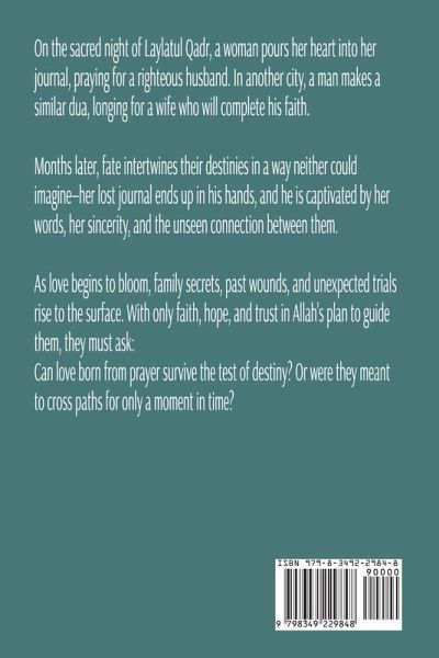 A Heartfelt Islamic Romance of Love, Destiny, and the Power of Dua On the sacred night of Laylatul Qadr, a woman pours her heart into her journal, praying for a righteous husband. In another city, a man writes a similar dua, longing for a wife who will complete his faith. Months later, fate intertwines their paths in an unimaginable way-her lost journal finds its way into his hands, and he is captivated by her words. As their love blossoms, family secrets and unforeseen trials threaten to tear them apart. With faith, love, and trust in Allah's plan, can they overcome the obstacles that stand between them? Or will destiny take them on separate paths? Perfect for fans of clean, faith-based romance, Written in the Ink of Fate is a mystical, heartwarming story of love, prayer, and divine connection.