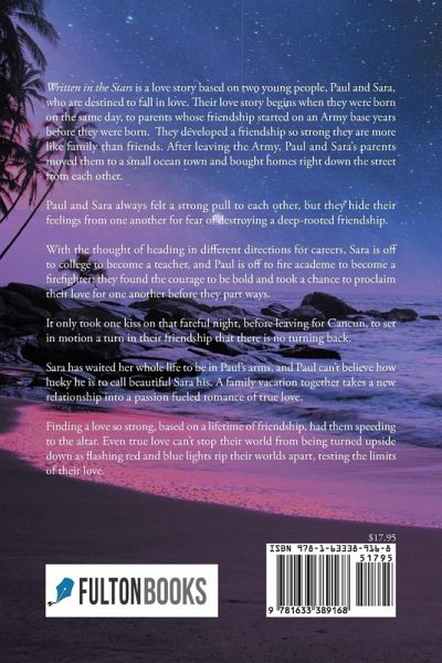 Written in the Stars is a love story based on two young people, Paul and Sara, who are destined to fall in love. Their love story begins when they were born on the same day, to parents whose friendship started on an Army base years before they were born. They developed a friendship so strong they are more like family than friends. After leaving the Army, Paul and Sara's parents moved them to a small ocean town and bought homes right down the street from each other. Paul and Sara always felt a strong pull to each other, but they hide their feelings from one another for fear of destroying a deep-rooted friendship. With the thought of heading in different directions for careers, Sara is off to college to become a teacher, and Paul is off to fire academe to become a firefighter; they found the courage to be bold and took a chance to proclaim their love for one another before they part ways. It only took one kiss on that fateful night, before leaving for Cancun, to set in motion a turn in their friendship that there is no turning back. Sara has waited her whole life to be in Paul's arms, and Paul can't believe how lucky he is to call beautiful Sara his. A family vacation together takes a new relationship into a passion fueled romance of true love. Finding a love so strong, based on a lifetime of friendship, had them speeding to the altar. Even true love can't stop their world from being turned upside down as flashing red and blue lights rip their worlds apart, testing the limits of their love.