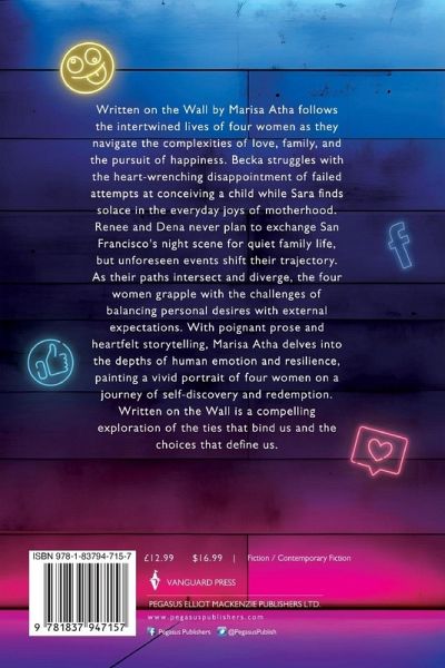 Written on the Wall by Marisa Atha follows the intertwined lives of four women as they navigate ¿the complexities of love, family, and the pursuit of happiness. Becka struggles with the heart-¿wrenching disappointment of failed attempts at conceiving a child while Sara finds solace in the ¿everyday joys of motherhood. Renee and Dena never plan to exchange San Francisco's night ¿scene for quiet family life, but unforeseen events shift their trajectory. As their paths intersect ¿and diverge, the four women grapple with the challenges of balancing personal desires with ¿external expectations. With poignant prose and heartfelt storytelling, Marisa Atha delves into the ¿depths of human emotion and resilience, painting a vivid portrait of four women on a journey of ¿self-discovery and redemption. Written on the Wall is a compelling exploration of the ties that ¿bind us and the choices that define us.