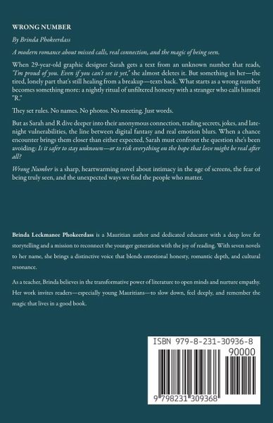 WRONG NUMBER By Brinda Phokeerdass A modern romance about missed calls, real connection, and the magic of being seen. When 29-year-old graphic designer Sarah gets a text from an unknown number that reads, "I'm proud of you. Even if you can't see it yet," she almost deletes it. But something in her-the tired, lonely part that's still healing from a breakup-texts back. What starts as a wrong number becomes something more: a nightly ritual of unfiltered honesty with a stranger who calls himself "R." They set rules. No names. No photos. No meeting. Just words. But as Sarah and R dive deeper into their anonymous connection, trading secrets, jokes, and late-night vulnerabilities, the line between digital fantasy and real emotion blurs. When a chance encounter brings them closer than either expected, Sarah must confront the question she's been avoiding: Is it safer to stay unknown-or to risk everything on the hope that love might be real after all? Wrong Number is a sharp, heartwarming novel about intimacy in the age of screens, the fear of being truly seen, and the unexpected ways we find the people who matter.