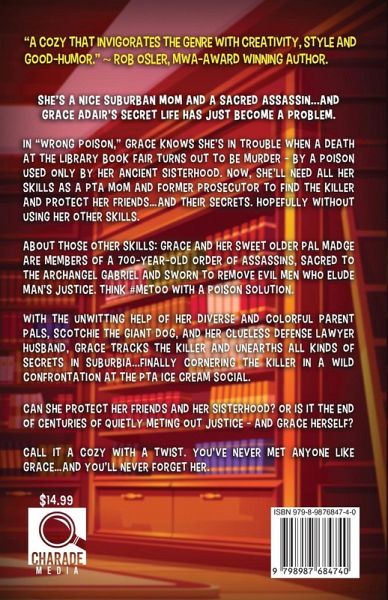 Grace Adair is your typical suburban mom, except for one little secret... She's also a member of a 700-year-old order of assassins sacred to the Archangel Gabriel and sworn to remove evil men who elude man's justice. Think #MeToo with a poison solution. But when a death at the Library Book Fair turns out to be murder by a poison used only by her ancient sisterhood, Grace knows she's in trouble. In Wrong Poison, Grace will need all her skills as a PTA mom and former prosecutor to find the killer and protect her friends...and their secrets. Hopefully without using her other skills. With the unwitting help of her diverse and colorful parent pals, Scotchie the Giant Dog, and her clueless defense lawyer husband, Grace tracks the killer, unearthing all kinds of suburban secrets along the way. Can she protect her friends and her sisterhood? Or is it the end of the centuries-old sisterhood-and Grace herself? One thing's for sure: you've never met a mom quite like Grace.