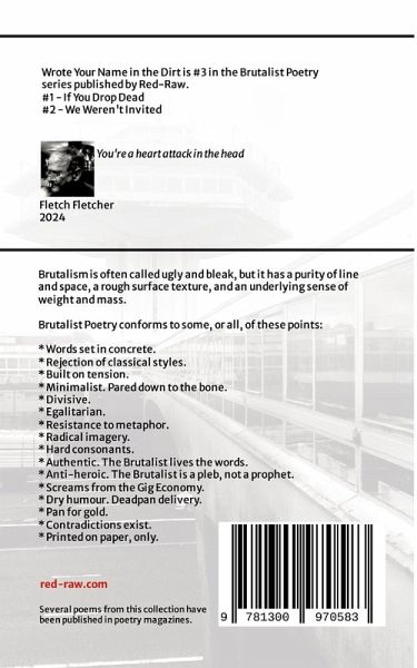 Wrote Your Name in the Dirt is #3 in the Brutalist Poetry series published by Red-Raw. #1 - If You Drop Dead #2 - We Weren't Invited Brutalism¿is often called ugly and bleak, but it has a purity of line and space, a rough surface texture, and an underlying sense of weight and mass. Poetry definition: artistic writing that stirs a reader's imagination using the lyrical arrangement of words i.e. meaning, sound, rhythm. Brutalist poets are different. Their music is discordant. They work in the Gig Economy and they suffer. They drink too much. They're in the airport pub long before the flight to Crete. Onboard they won't sit still, won't shut up, and the plane gets diverted to Utrecht. They're taken off in cuffs and everyone cheers, films it for TikTok. This is the poet of the Wetherspoon generation. This is the poet I want. Brutalist on the page and Brutalist in the head.