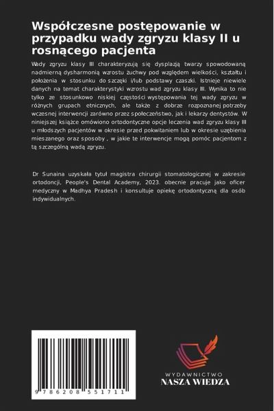 Wady zgryzu klasy III charakteryzuj¿ si¿ dysplazj¿ twarzy spowodowan¿ nadmiern¿ dysharmoni¿ wzrostu ¿uchwy pod wzgl¿dem wielko¿ci, ksztätu i po¿o¿enia w stosunku do szcz¿ki i/lub podstawy czaszki. Istnieje niewiele danych na temat charakterystyki wzrostu wad zgryzu klasy III. Wynika to nie tylko ze stosunkowo niskiej cz¿sto¿ci wyst¿powania tej wady zgryzu w ró¿nych grupach etnicznych, ale tak¿e z dobrze rozpoznanej potrzeby wczesnej interwencji zarówno przez spo¿ecze¿stwo, jak i lekarzy dentystów. W niniejszej ksi¿¿ce omówiono ortodontyczne opcje leczenia wad zgryzu klasy III u m¿odszych pacjentów w okresie przed pokwitaniem lub w okresie uz¿bienia mieszanego oraz sposoby , w jakie te interwencje mog¿ pomóc pacjentom z t¿ szczególn¿ wad¿ zgryzu.