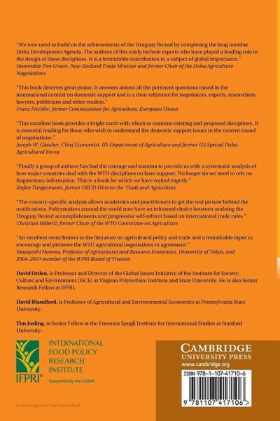 Farm support is contentious in international negotiations. This in-depth assessment of the legal compliance and economic evaluation issues raised by the WTO Agreement on Agriculture presents consistent support data and forward-looking projections for eight developed and developing countries (EU, US, Japan, Norway, Brazil, China, India, Philippines), using original estimates where official notifications are not available. Variations over time in notified support in some cases reflect real policy changes; others merely reflect shifts in how countries represent their measures. The stalled Doha negotiations presage significantly tighter constraints for developed countries that provide the highest support, but loopholes will persist. Developing countries face fewer constraints and their trade-distorting farm support can rise. Pressure points and key remaining issues if a Doha agreement is reached are evaluated. Vigilant monitoring for compliance of farm support with WTO commitments will be required to lessen its negative consequences whether or not the Doha Round is concluded.