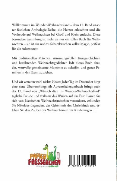 Willkommen im Wunder-Weihnachtsland - dem 17. Band unserer festlichen Anthologie-Reihe, die Herzen erleuchtet und die Vorfreude auf Weihnachten bei Groß und Klein entfacht. Diese besondere Sammlung ist mehr als nur ein tolles Buch für Weihnachten - sie ist ein wahres Schatzkästchen voller Magie, perfekt für die Adventszeit.Mit traditionellen Märchen, stimmungsvollen Kurzgeschichten und berührenden Weihnachtsgedichten lädt dieses Buch dazu ein, wertvolle gemeinsame Momente zu schaffen und ganze Familien in den Bann zu ziehen.Und wir verraten wohl nichts Neues: Jeder Tag im Dezember birgt eine neue Überraschung: Als Adventskalenderbuch bringt auch der 17. Band von "Wünsch dich ins Wunder-Weihnachtsland" tägliche Freude und verkürzt das Warten auf das Fest. Lassen Sie sich von klassischen Weihnachtsmärchen verzaubern, erkunden Sie Nikolaus-Legenden, das Geheimnis des Christkinds und erleben Sie den Zauber der Weihnachtszeit mit Kinderaugen ...Ob als Weihnachtsbuch zum Einschlafen oder als Adventsbuch voller Geschichten und Gedichte - dieses Buch wird die Fantasie nicht nur der Kinder beflügeln. Ideal für die Weihnachtszeit und als Geschenk, das Augen zum Leuchten bringt, ist es ein Muss für jede Familie.