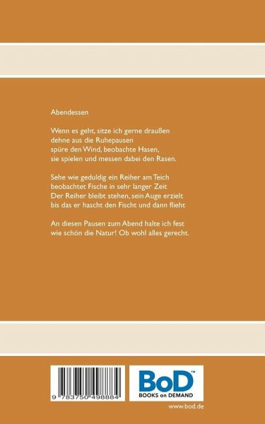 AbendessenWenn es geht, sitze ich gerne draußendehne aus die Ruhepausenspüre den Wind, beobachte Hasen,sie spielen und messen dabei den Rasen.Sehe wie geduldig ein Reiher am Teichbeobachtet Fische in sehr langer ZeitDer Reiher bleibt stehen, sein Auge erzielt bis das er hascht den Fischt und dann fliehtAn diesen Pausen zum Abend halte ich festwie schön die Natur! Ob wohl alles gerecht?
