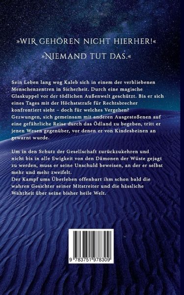 Sein Leben lang wog Kaleb sich in einem der verbliebenen Menschenzentren in Sicherheit. Durch eine magische Glaskuppel vor der tödlichen Außenwelt geschützt. Bis er sich eines Tages mit der Höchststrafe für Rechtsbrecher konfrontiert sieht - doch für welches Vergehen?Gezwungen, sich gemeinsam mit anderen Ausgestoßenen auf eine gefährliche Reise durch das Ödland zu begeben, tritt er jenen Wesen gegenüber, vor denen er von Kindesbeinen an gewarnt wurde. Um in den Schutz der Gesellschaft zurückzukehren und nicht bis in alle Ewigkeit von den Dämonen der Wüste gejagt zu werden, muss er seine Unschuld beweisen, an der er selbst mehr und mehr zweifelt.Der Kampf ums Überleben offenbart ihm schon bald die wahren Gesichter seiner Mitstreiter und die hässliche Wahrheit über seine bisher heile Welt.Triggerwarnung: Gewalt, Blut, Kraftausdrücke, Substanzmissbrauch, Erbrechen, sexuelle Gewalt (erwähnt)