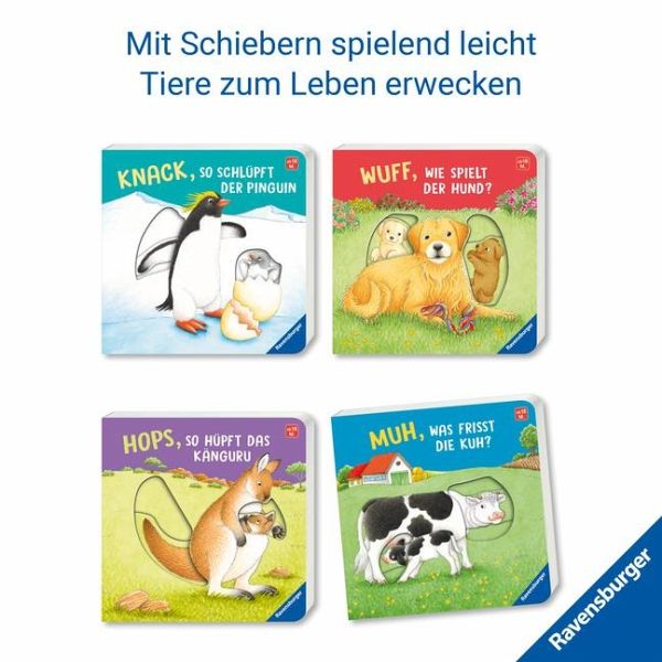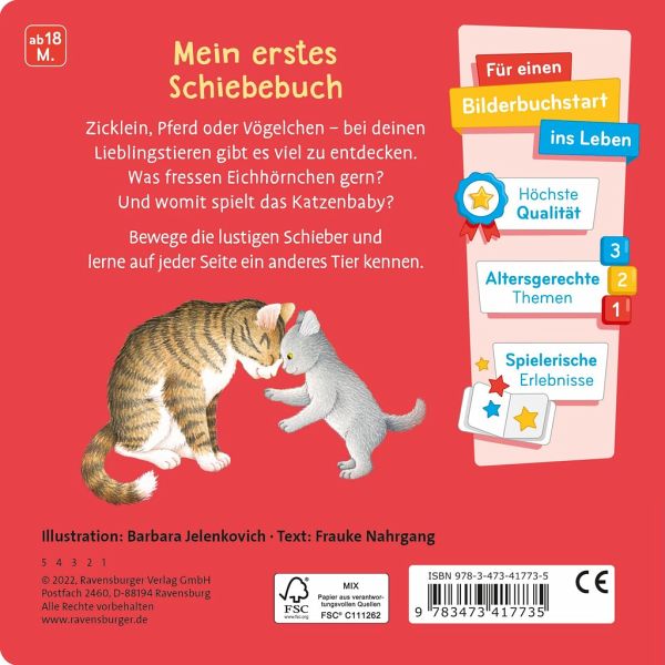 Kleinkinder lernen in diesem ersten Schiebebuch die Tierwelt kennen. Realistische Bilder sowie lustige und spannende Schiebeeffekte helfen beim Sprechenlernen und vermitteln mit kurzen Texten erstes Sachwissen zu Lieblingstieren. Die Schieber sind stabil und leicht beweglich und fördern die Motorik.