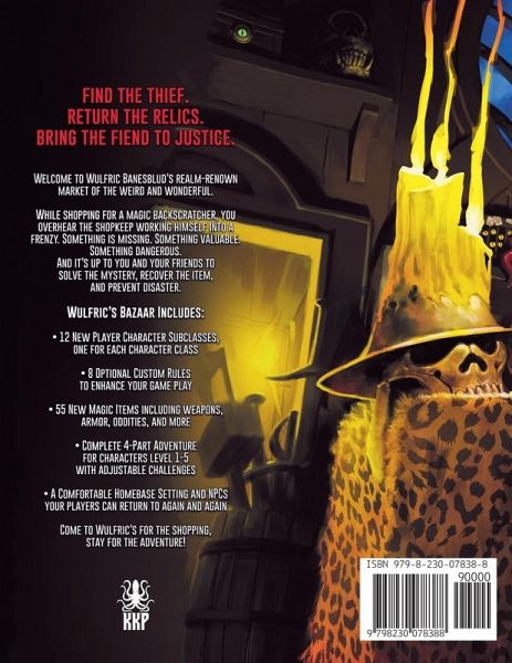 Level up your 5e fantasy and Dungeons & Dragons games with new character subclasses, magic items, and a mini-campaign! Find the thief. Return the relics. Bring the fiend to justice. Wulfric's Bazaar of the Bizarre is a 5E fantasy (D&D) supplement and adventure. Like a bag of holding, it packs a huge amount of new material for your fantasy game, along with detailed maps, amazing digital artwork, and a big witch's cauldron full of fun. Welcome to Wulfric Banesblud's realm-renown market of the weird and wonderful. While shopping for a magic backscratcher, you overhear the shopkeep working himself into a frenzy. Something is missing. Something valuable. Something dangerous. And it's up to you and your friends to solve the mystery, recover the item, and prevent disaster. Wulfric's Bazaar includes:12 New Player Character Subclasses, one for each character class. 8 Optional Custom Rules to enhance your game play. 55 New Magic Items including weapons, armor, oddities, and more. Complete 4-Part Adventure for characters level 1-5 with adjustable combat. A comfortable home base setting and NPCs your players can return to again and again. Innumerable pop culture and movie references - can you spot them all? Welcome to Wulfric's. Come for the shopping, stay for the adventure! (Note that this listing has a black & white interior.)