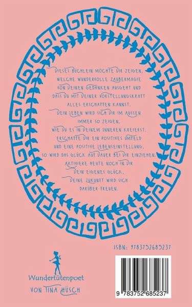 Dieses Büchlein möchte Dir zeigen, welche wundervolle Zaubermagie von Deinen Gedanken ausgeht und dass Du mit Deiner Vorstellungskraft alles erschaffen kannst.Dein Leben wird sich Dir im Außen immer so zeigen, wie Du es in Deinem Inneren kreierst.Erschaffe Dir ein positives Umfeld und eine positive Lebenseinstellung, so wird das Glück auf Dauer bei Dir einziehen.Aktiviere heute noch in Dir Dein eigenes Glück, Deine Zukunft wird sich darüber freuen.