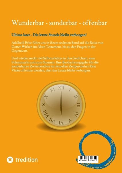 Adelheid Erbe nimmt uns in ihrem sechsten Band mit auf die Reise von Gottes Wirken im Alten Testament, zu den persönlichen Fragen in der Gegenwart. Und wieder steckt viel Selbsterlebtes in den Gedichten, zum Schmunzeln und zum Staunen. Ihre Beobachtungen lassen Vieles offenbar werden, aber das Letzte bleibt verborgen.