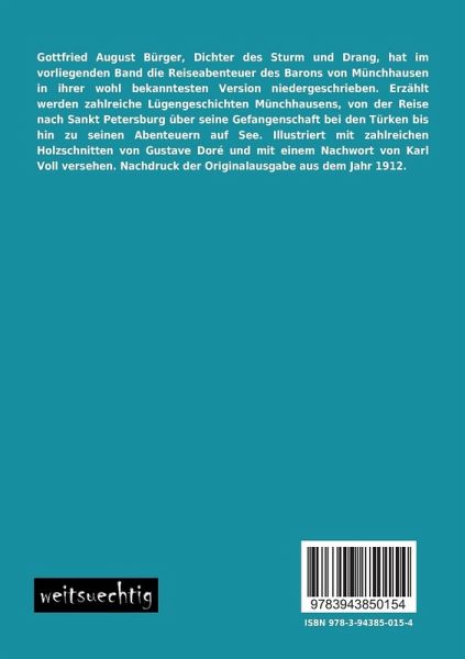 Gottfried August Bürger, Dichter des Sturm und Drang, hat im vorliegenden Band die Reiseabenteuer des Barons von Münchhausen in ihrer wohl bekanntesten Version niedergeschrieben. Erzählt werden zahlreiche Lügengeschichten Münchhausens, von der Reise nach Sankt Petersburg über seine Gefangenschaft bei den Türken bis hin zu seinen Abenteuern auf See. Illustriert mit zahlreichen Holzschnitten von Gustave Doré und mit einem Nachwort von Karl Voll versehen. Nachdruck der Originalausgabe aus dem Jahr 1912.