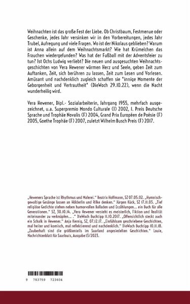 Weihnachten ist das große Fest der Liebe. Ob Christbaum, Festmenue oder Geschenke, jedes Jahr versinken wir in den Vorbereitungen, jedes Jahr Trubel, Aufregung und viele Fragen. Wo ist der Nikolaus geblieben? Warum ist Anna allein auf dem Weihnachtsmarkt? Wie hat Krümelchen das Frauchen wiedergefunden? Was hat der Fußball mit der Adventsfeier zu tun? Ist Ochs Ludwig verliebt? Die neuen und ausgesuchten Weihnachtsgeschichten von Vera Hewener wärmen Herz und Seele, geben Zeit zum Auftanken, Zeit, sich berühren zu lassen, Zeit zum Lesen und Vorlesen. Amüsant und nachdenklich zugleich schaffen sie "innige Momente der Geborgenheit und Vertrautheit" (DieWoch 29.10.22), wenn die Nacht wunderheilig wird.