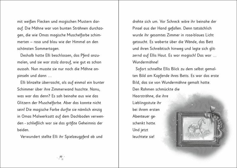 Mit der magischen Farbe ihrer Oma malt Elli ihr Traumpferd. Plötzlich verschwimmt alles vor ihren Augen und Wundermähne erwacht zum Leben.