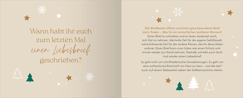 Dieser Adventskalender für Paare steckt voller einzigartiger Anregungen für eine ganz besonders romantische Vorweihnachtszeit. Auf seinen Seiten zum Aufschneiden findet ihr 24 tolle Ideen für unvergessliche Momente zu zweit: Schreibt euch doch mal wieder gegenseitig einen Liebesbrief oder besucht gemeinsam einen Ort, der für euch beide eine ganz besondere Bedeutung hat. Die 24 kleinen Aufgaben schaffen unvergessliche Momente für euch, die eure Beziehung mit Liebe und Zärtlichkeit bereichern wird!