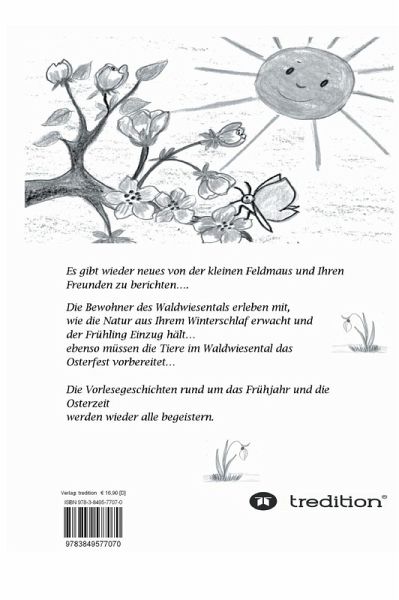 Die Natur hat den Frühling ins Waldwiesental gebracht und das Osterfest ist nicht mehr fern. Neue Abenteuer warten auf die kleine Feldmaus und Ihre Freunde. Wundersame Frühlings- und Ostergeschichten von Johanna Hopp berichten vom schlafenden Wind, vom Rasenmäher, der nicht nur das Gras sondern auch die Frühlingsblumen abschneidet und nicht zuletzt macht die eingebildete Henne Elli eine wichtige Erfahrung. Die Gans mit den lila Federn gibt Rätsel auf und es taucht die Frage auf: Wo ist das blau des Regenbogens? Diese und noch viele andere Geschichten werden wieder große und kleine Leute erfreuen. Das vorliegende Buch ist das dritte Buch der Autorin Johanna Hopp aus der Reihe wundersame Geschichten...