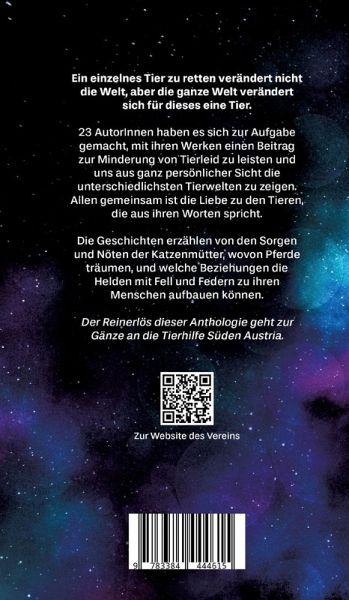 Ein einzelnes Tier zu retten verändert nicht die Welt, aber die ganze Welt verändert sich für dieses eine Tier.23 AutorInnen haben es sich zur Aufgabe gemacht, mit ihren Werken einen Beitrag zur Minderung von Tierleid zu leisten und uns aus ganz persönlicher Sicht die unterschiedlichsten Tierwelten zu zeigen. Allen gemeinsam ist die Liebe zu den Tieren, die aus ihren Worten spricht. Die Geschichten erzählen von Katzenfreundschaften, wovon Pferde träumen, und welche Beziehungen die Helden mit Fell und Federn zu ihren Menschen aufbauen können.Der Reinerlös dieser Anthologie geht zur Gänze an die Tierhilfe Süden Austria.