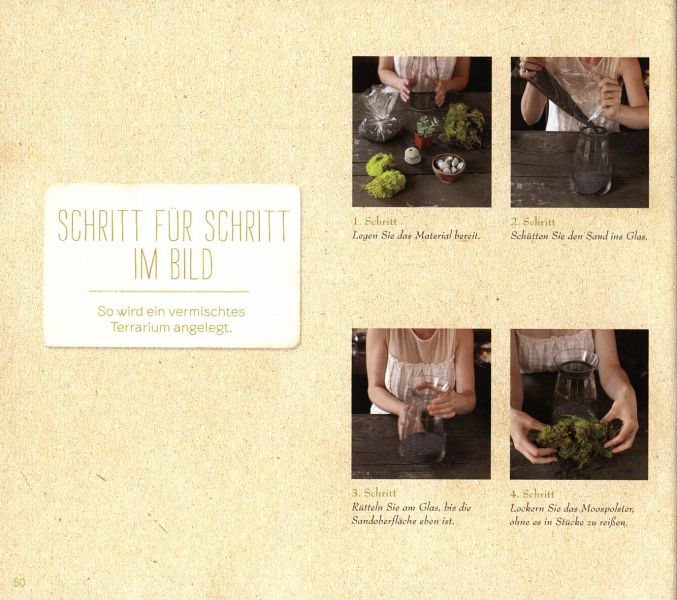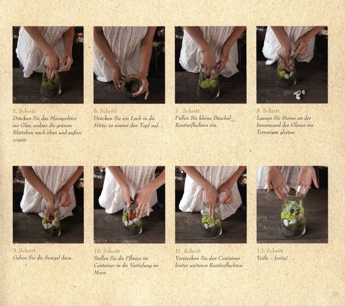 Es ist sehr einfach, sich eine kleine Pflanzen-Wunderwelt im Glas zu schaffen. Man muss nur die richtigen Gefäße wählen, das optimale Pflanzsubstrat und die dafür wirklich geeigneten Pflanzen. Die 50 Schritt-für-Schritt-Anleitungen für individuelle Projekte sind leicht nachzuvollziehen und sehr inspirierend. Lauter kleine Mini-Biotope können geschaffen werden - z. B. kleine Regenwälder, Meeresküsten, Wüsten und Fantasieszenen - alles in einer Größe, die auf ein Fensterbrett passt.