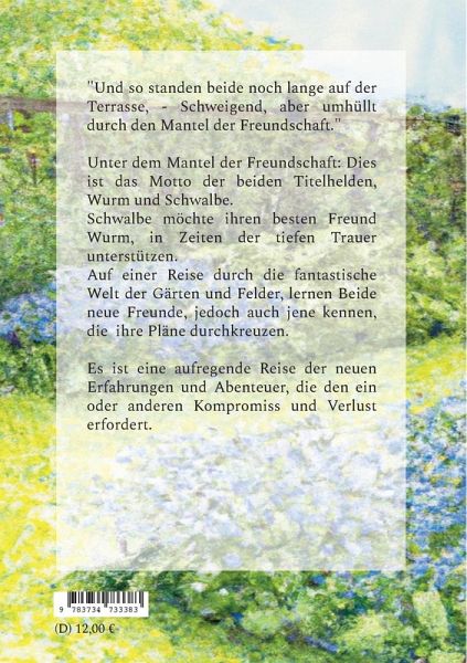 "Und so standen beide noch lange auf der Terrasse, - Schweigend, aber umhüllt durch den Mantel der Freundschaft."Unter dem Mantel der Freundschaft: Dies ist das Motto der beiden Titelhelden, Wurm und Schwalbe.Schwalbe möchte ihren besten Freund Wurm, in Zeiten der tiefen Trauer unterstützen.Auf einer Reise durch die fantastische Welt der Gärten und Felder, lernen Beide neue Freunde, jedoch auch jene kennen, die ihre Pläne durchkreuzen.Es ist eine aufregende Reise der neuen Erfahrungen und Abenteuer, die den ein oder anderen Kompromiss und Verlust erfordert.