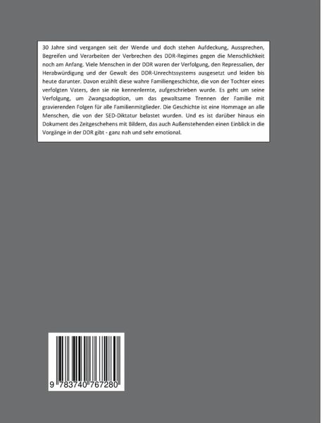30 Jahre sind vergangen seit der Wende und doch stehen Aufdeckung, Aussprechen, Begreifen und Verarbeiten der Verbrechen des DDR-Regimes gegen die Menschlichkeit noch am Anfang. Viele Menschen in der DDR waren der Verfolgung, den Repressalien, der Herabwürdigung und der Gewalt des DDR-Unrechtssystems ausgesetzt und leiden bis heute darunter. Davon erzählt diese wahre Familiengeschichte, die von der Tochter eines verfolgten Vaters, den sie nie kennenlernte, aufgeschrieben wurde. Es geht um seine Verfolgung, um Zwangsadoption, um das gewaltsame Trennen der Familie mit gravierenden Folgen für alle Familienmitglieder. Die Geschichte ist eine Hommage an alle Menschen, die von der SED-Diktatur belastet wurden. Und es ist darüber hinaus ein bildhaftes Geschichtsdokument, das auch Außenstehenden einen Einblick in die Vorgänge in der DDR gibt - ganz nah und sehr emotional.