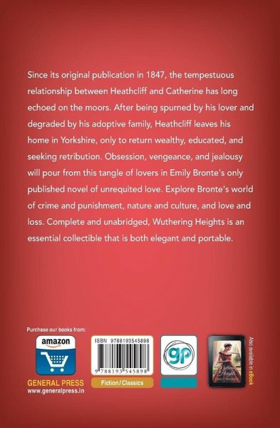 Since its original publication in 1847, the tempestuous relationship between Heathcliff and Catherine has long echoed on the moors. After being spurned by his lover and degraded by his adoptive family, Heathcliff leaves his home in Yorkshire, only to return wealthy, educated, and seeking retribution. Obsession, vengeance, and jealousy will pour from this tangle of lovers in Emily Bronte's only published novel of unrequited love. Explore Bronte's world of crime and punishment, nature and culture, and love and loss. Complete and unabridged, Wuthering Heights is an essential collectible that is both elegant and portable. ABOUT THE AUTHOR: Emily Jane Brontë was an English novelist and poet, best remembered for her only novel, Wuthering Heights, now considered a classic of English literature. Emily was the third eldest of the four surviving Brontë siblings, between the youngest Anne and her brother Branwell. She wrote under the pen name Ellis Bell.