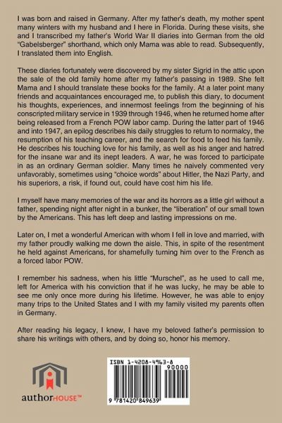 I was born and raised in Germany. After my father's death, my mother spent many winters with my husband and I here in Florida. During these visits, she and I transcribed my father's World War II diaries into German from the old "Gabelsberger" shorthand, which only Mama was able to read. Subsequently, I translated them into English. These diaries fortunately were discovered by my sister Sigrid in the attic upon the sale of the old family home after my father's passing in 1989. She felt Mama and I should translate these books for the family. At a later point many friends and acquaintances encouraged me, to publish this diary, to document his thoughts, experiences, and innermost feelings from the beginning of his conscripted military service in 1939 through 1946, when he returned home after being released from a French POW labor camp. During the latter part of 1946 and into 1947, an epilog describes his daily struggles to return to normalcy, the resumption of his teaching career, and the search for food to feed his family. He describes his touching love for his family, as well as his anger and hatred for the insane war and its inept leaders. A war, he was forced to participate in as an ordinary German soldier. Many times he naively commented very unfavorably, sometimes using "choice words" about Hitler, the Nazi Party, and his superiors, a risk, if found out, could have cost him his life. I myself have many memories of the war and its horrors as a little girl without a father, spending night after night in a bunker, the "liberation" of our small town by the Americans. This has left deep and lasting impressions on me. Later on, I met a wonderful American with whom I fell in love and married, with my father proudly walking me down the aisle. This, in spite of the resentment he held against Americans, for shamefully turning him over to the French as a forced labor POW. I remember his sadness, when his little "Murschel", as he used to call me, left for America wit