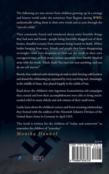 The following are true stories from children growing up in a strange and bizarre world under the notorious Nazi Regime during WWII, authentically telling them in their own words and as seen through the "eyes of a child." They constantly feared and wondered about some horrible things they had seen and heard--people being forcefully dragged out of their homes, dreadful screams from someone being beaten to death, lifeless bodies hanging from trees, friends and people they knew disappearing overnight--and were desperate to find out the truth in their own courageous ways as their many curious questions were harshly brushed away with the words "Hush, hush! You have not seen anything, and you do not tell anyone!" Bravely, they endured earth-shattering air raids in dark freezing-cold bunkers and shared the exhilarating joy expressed by every surviving soul. Amazingly, in the middle of chaos, they played happily in the rubble of war. Read about the children's own ingenious humanitarian aid campaigns they created and how their accomplishments were able to bring much-needed relief to many elderly and sick citizens of their small town. Lastly, learn about the children's curious and heart-warming relationships they formed with the soldiers of the Ninetieth Infantry Division of the United States Army in Germany in April 1945. This book is written for the children of "today and tomorrow" to remember the children of "yesterday." Monika Danhof