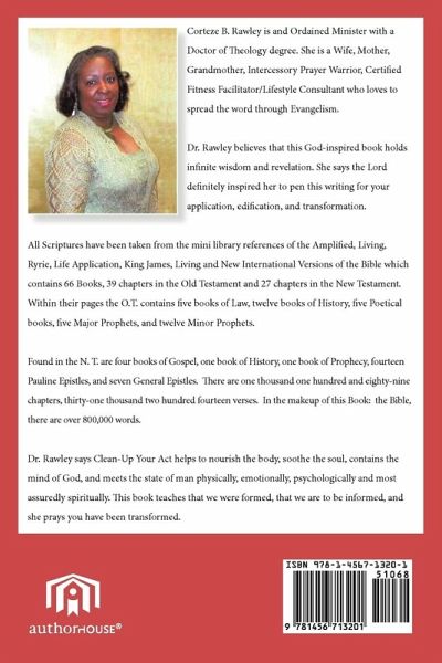 Clean Up Your Act is the title of my new book that will not only help jump-start and enhance your life, but help you get the tune-up you need to wake up your spirit, feed your mind and rejuvenate your body to prepare you to become fit for the Master's use inside and out. It provides a variety of information that will aid you in identifying nutritional food selections, making lifestyle changes and choices for the renewing, healing and cleansing of your body as you integrate the Word of God as an aid to help you achieve your specific goals.