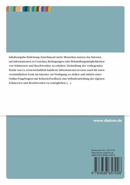 Zunehmend mehr Menschen nutzen das Internet, um Informationen zu Ursachen, Bedingungen oder Behandlungsmöglichkeiten von Schmerzen und Beschwerden zu erhalten. Zielstellung der vorliegenden Studie war es, wissenschaftlich fundierte Informationen in einer auch für Laien verständlichen Form im Internet zur Verfügung zu stellen und mittels eines Online-Fragebogens mit Echtzeit-Feedback eine Selbstbeurteilung der eigenen Schmerzen und Beschwerden zu ermöglichen. Die dabei erhobenen Daten sollten darüber hinaus Aussagen zur Auftretenshäufigkeit von Schmerzen und Beschwerden, zu Beeinträchtigungen und zu Zusammenhängen mit soziodemographischen und weiteren psychologischen Variablen in einer repräsentativen Stichprobe von Internet-Usern ermöglichen.