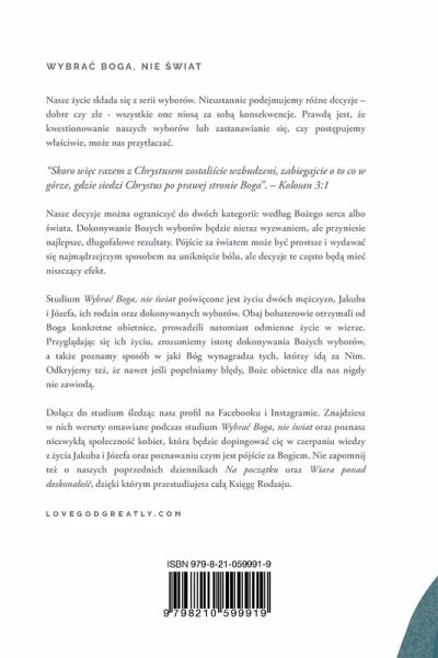 Nasze ¿ycie sk¿ada si¿ z serii wyborów. Nieustannie podejmujemy ró¿ne decyzje - dobre czy z¿e i wszystkie one nios¿ za sob¿ konsekwencje. Prawd¿ jest, ¿e kwestionowanie naszych wyborów lub zastanawianie si¿, czy post¿pujemy w¿äciwie, möe nas przyt¿aczä. "Skoro wi¿c razem z Chrystusem zostali¿cie wzbudzeni, zabiegajcie o to co w górze, gdzie siedzi Chrystus po prawej stronie Boga". - Kolosan 3:1 Nasze decyzje möna ograniczy¿ do dwóch kategorii: wed¿ug Böego serca albo ¿wiata. Dokonywanie Bozych wyborów b¿dzie nieraz wyzwaniem, ale przyniesie najlepsze, d¿ugofalowe rezultaty. Pój¿cie za ¿wiatem möe by¿ prostsze i wydawä si¿ najm¿drzejrzym sposobem na unikni¿cie bólu, ale decyzje te cz¿sto b¿d¿ mie¿ niszcz¿cy efekt. Studium Wybrä Boga, nie ¿wiat pöwi¿cone jest ¿yciu dwóch m¿¿czyzn, Jakuba i Józefa, ich rodzin oraz dokonywanych wyborów. Obaj bohaterowie otrzymali od Boga konkretne obietnice, prowadzili natomiast odmienne ¿ycie w wierze. Przygl¿daj¿c si¿ ich ¿yciu, zrozumiemy istot¿ dokonywania Böych wyborów, a tak¿e poznamy sposób w jaki Bóg wynagradza tych, którzy id¿ za Nim. Odkryjemy te¿, ¿e nawet je¿li pope¿niamy b¿¿dy, Böe obietnice dla nas nigdy nie zawiod¿. Dö¿cz do studium ¿ledz¿c nasz profil na Facebooku i Instagramie. Znajdziesz w nich wersety omawiane podczas studium Wybrä Boga, nie ¿wiat oraz poznasz niezwyk¿¿ spöecznö¿ kobiet, która b¿dzie dopingowä ci¿ w czerpaniu wiedzy z ¿ycia Jakuba i Józefa oraz poznawaniu czym jest pój¿cie za Bogiem. Nie zapomnij te¿ o naszych poprzednich dziennikach Na pocz¿tku oraz Wiara ponad doskonäö¿, dzi¿ki którym przestudiujesz cä¿ Ksi¿g¿ Rodzaju.