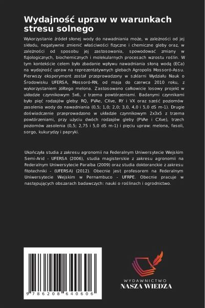 Wykorzystanie ¿róde¿ s¿onej wody do nawadniania mo¿e, w zale¿no¿ci od jej sk¿adu, negatywnie zmieni¿ w¿äciwo¿ci fizyczne i chemiczne gleby oraz, w zale¿no¿ci od sposobu jej zastosowania, spowodowä zmiany w fizjologicznych, biochemicznych i molekularnych procesach wzrostu ro¿lin. W tym kontek¿cie celem by¿o zbadanie wp¿ywu nawadniania s¿on¿ wod¿ (ECa) na wydajno¿¿ upraw na reprezentatywnych glebach Agropolis Mossoró-Assu. Pierwszy eksperyment zostä przeprowadzony w szklarni Wydziäu Nauk o ¿rodowisku UFERSA, Mossoró-RN, od maja do czerwca 2010 roku, z wykorzystaniem ¿ó¿tego melona. Zastosowano cäkowicie losowy projekt w uk¿adzie czynnikowym 5x6, z trzema powtórzeniami. Badanymi czynnikami by¿o pi¿¿ rodzajów gleby: RQ, PVAe, CXve, RY i VX oraz sze¿¿ poziomów zasolenia wody do nawadniania (0,5; 1,0; 2,0; 3,0, 4,0 i 5,0 dS m-1). Drugie do¿wiadczenie przeprowadzono w uk¿adzie czynnikowym 2x3x5 z trzema powtórzeniami, przy u¿yciu dwóch rodzajów gleby (PVAe i CXve), trzech poziomów zasolenia (0,5; 2,75 i 5,0 dS m-1) i pi¿ciu upraw: melona, fasoli, sorgo, kukurydzy i papryki.