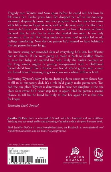 Tragedy tore Wynter and Sam apart before he could tell her how he felt about her. Twelve years later, fate dropped her off on his doorstep, widowed, desperately broke, and very pregnant. Sam has spent his entire adult life trying to forget Wynter, and here she was, ready to collect on a promise he'd made when he was young and in love. His sense of honor dictated that he take her in when she needed him most. It was only temporary, after all. But living under the same roof quickly led to old feelings resurfacing. Now the one person he'd wanted to leave behind is the one person he can't let go. She knew seeing her reminded Sam of everything he'd lost, but Wynter had no choice. If she were going to make it back to Scallop Shores to raise her baby, she needed his help. Only she hadn't counted on the long winter nights or getting reacquainted with a childhood friend she'd loved like a brother - a friend who'd grown into a man she found herself wanting to get to know on a whole different level. Delivering Wynter's baby at home during a fierce snow storm forces Sam to fill in as temporary dad. It's a role he'd gladly make permanent. Too bad the one place Wynter is determined to raise her daughter is the one place Sam swore he'd never step foot in again. Had he gotten a second chance to tell her he loved her only to lose her again? Or is this time for keeps? Sensuality Level: Sensual