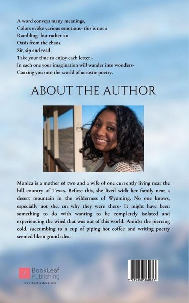 ""A word conveys many meanings, Colors evoke various emotions this is not a Rambling rather an Oasis from the chaos. Sit, sip and read Take your time to enjoy each letter In each one your imagination will wander into wonders Coaxing you into the world of acrostic poetry.""