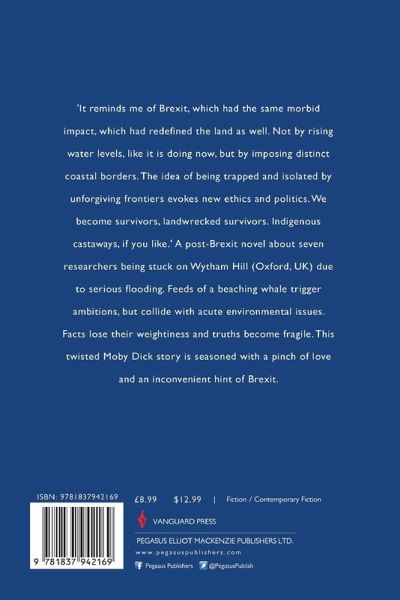 'It reminds me of Brexit, which had the same morbid impact, which ¿had redefined the land as well. Not by rising water levels, like it is ¿doing now, but by imposing distinct coastal borders. The idea of ¿being trapped and isolated by unforgiving frontiers evokes new ethics ¿and politics. We become survivors, landwrecked survivors. ¿Indigenous castaways, if you like.' A post-Brexit novel about seven ¿researchers being stuck on Wytham Hill (Oxford, UK) due to serious ¿flooding. Feeds of a beaching whale trigger ambitions, but collide ¿with acute environmental issues. Facts lose their weightiness and ¿truths become fragile. This twisted Moby Dick story is seasoned with ¿a pinch of love and an inconvenient hint of Brexit.¿