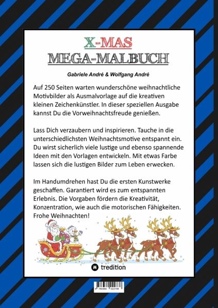 In dieser X-Mas Edition XXL - Mega Malbuch - Band 17, erwarten Dich 250 tolle weihnachtliche Motive, mit denen Du kreativ in die unterschiedlichsten Themen der stimmungsvollen Vorweihnachtszeit eintauchen kannst. Deiner Fantasie sind dabei keine Grenzen gesetzt. Lass Deinen Ideen rund um die Bilder freien Lauf und ergänze so manches Motiv beliebig nach Deiner Vorstellung. Lass Dich verzaubern und inspirieren. Die Ausmalvorlagen sind extra so aufbereitet, dass man sie leicht scannen, kopieren oder abpausen kann. Somit kannst Du auch ganz leicht eigene Bilder kreieren und sie auch öfter mal verwenden. Mit den verschiedenen Vorgaben wirst Du im Handumdrehen Deine eigenen ersten Kunstwerke schaffen. Wende Dein bislang erlangtes Wissen vom Zeichnen und Malen in den verschiedenen Themen an. Die vom Team, der inVia Online Schule, zusammengestellten Motive, bieten Dir individuelle Themen zum Entdecken. Das vielfältige Angebot der Vorgaben fördert die Kreativität, insbesondere die Konzentration und erleichtert ebenso das Erlernen der motorischen Fähigkeiten. Durch aufmerksame Beschäftigung werden zauberhafte Bilder entstehen. Tauche begeistert in die Welt der weihnachtlichen Farben ein! Viel Spaß und Erfolg! Wir wünschen Dir ein frohes Weihnachtsfest!