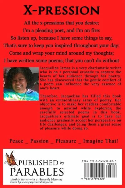 All the X-pressions that you desire; I'm a pleasing poet, and I'm on fire: So listen up, because I have some things to say, That's sure to keep you inspired throughout your day: Come and wrap your mind around my thoughts; I have written some poems; that you can't do without Jacqueline James is a very charismatic writer who is on a personal crusade to capture the hearts of her audience through her poetry. She has discovered that the gentle comfort of a poem can influence the very essence of one's heart. Therefore, Jacqueline has filled this book with an extraordinary array of poetry. Her objective is to make her readers comfortable enough to unwind while exploring the carefully selected poems in this book. Jacqueline's ultimate goal is to have her audience gradually accept her perspective on life challenges,and bring them a great sense of pleasure while doing so. Peace _ Passion _ Pleasure _ Imagine That!