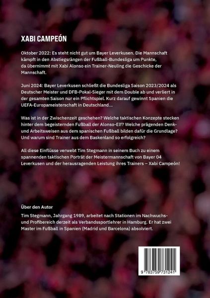 Das Buch "Xabi Campeón" handelt von Xabi Alonsos Spielidee, der Entwicklung dieser Idee (von seiner Zeit bei der zweiten Mannschaft von Real Sociedad San Sebastián bis jetzt bei Bayer 04 Leverkusen) und vor allem von der Reise der Mannschaft von Bayer Leverkusen seit Xabis Ankunft und ihrem Weg zum ersten Mal in der Geschichte Deutscher Meister zu werden. Darüber hinaus geht es in diesem Buch nicht nur um Xabi; es ist ein Buch über Fußballtaktik, das vor allem die spanische (oder besser gesagt: "Barca"-) Perspektive auf den Fußball vermittelt, da sie im spanischen und im Welt-Fußball eine so einflussreiche Idee ist. Aus diesem Grund ist das Buch auch ein Werk zur grundlegenden Erklärung der Taktik aus dieser Perspektive. Das Buch beinhaltet: - Erläuterung des Ausdrucks "Spielmodell" / "Spielidee" unter dem Gesichtspunkt der Komplexität. - Erklärung der allgemeinen Ausdrücke und Intentionen innerhalb der spanischen Perspektive auf Fußball - Erklärung des Konzeptes des Positionsspiels - Analyse der allgemeinen Konzepte von Xabi Alonso bei Real Sociedad San Sebastián - Einblick in die Arbeitsweise der Jugendakademie von Real Sociedad San Sebastián - Analyse der Konzepte und Entwicklungen seit der Ankunft von Xabi Alonso in seiner ersten Saison - Erklärung des Konzeptes der Phasenräume - Analyse und Kontextualisierung jedes Spieles der Meistersaison - Erläuterung das Konzept der "geteilten Intentionen" - Ausblick auf die mögliche Entwicklung der Mannschaft von Bayer Leverkusen in der Zukunft - Datenanalyse und Positionsprofile - Erläuterungen der Absichten und Überlegungen zum Coaching - praktische Vorschläge für Trainingskontexte