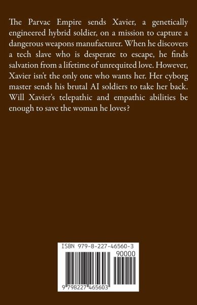 The Parvac Empire sends Xavier, a genetically engineered hybrid soldier, on a mission to capture a dangerous weapons manufacturer. When he discovers a tech slave who is desperate to escape, he finds salvation from a lifetime of unrequited love. However, Xavier isn't the only one who wants her. Her cyborg master sends his brutal AI soldiers to take her back. Will Xavier's telepathic and empathic abilities be enough to save the woman he loves?