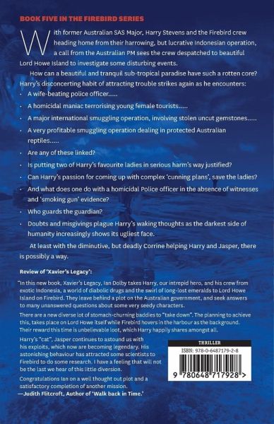 With former Australian SAS Major, Harry Stevens and the Firebird crew heading home from their harrowing, but lucrative Indonesian operation, a call from the Australian PM sees the crew despatched to beautiful Lord Howe Island to investigate some disturbing events. How can a beautiful and tranquil sub-tropical paradise have such a rotten core? Harry's disconcerting habit of attracting trouble strikes again as he encounters:A wife-beating police officer..... A homicidal maniac terrorising young female tourists..... A major international smuggling operation, involving stolen uncut gemstones..... A very profitable smuggling operation dealing in protected Australian reptiles..... Are any of these linked? Is putting two of Harry's favourite ladies in serious harm's way justified? Can Harry's passion for coming up with complex 'cunning plans', save the ladies? And what does one do with a homicidal Police officer in the absence of witnesses and 'smoking gun' evidence? Who guards the guardian? Doubts and misgivings plague Harry's waking thoughts as the darkest side of humanity increasingly shows its ugliest face. At least with the diminutive, but deadly Corrine helping Harry and Jasper, there is possibly a way.