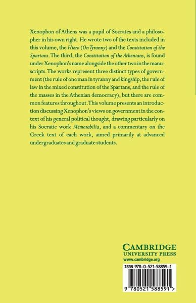 Xenophon of Athens was a pupil of Socrates and a philosopher in his own right. He wrote two of the texts included in this volume, the Hiero (On Tyranny) and the Constitution of the Spartans. The third, the Constitution of the Athenians, is found under Xenophon's name alongside the other two in the manuscripts. The works represent three distinct types of government (the rule of one man in tyranny and kingship, the rule of law in the mixed constitution of the Spartans, and the rule of the masses in the Athenian democracy), but there are common features throughout. This volume presents an introduction discussing Xenophon’s views on government in the context of his general political thought, drawing particularly on his Socratic work Memorabilia, and a commentary on the Greek text of each work aimed primarily at advanced undergraduates and graduate students.