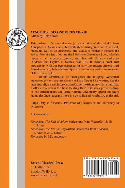 This volume offers a selection (about a third of the whole) from Xenophon's Oeconomicus, his work about management of the ancient, relatively well-to-do household and estate. It probably reflects the period from the late 390s and the 380s when Xenophon lived, after his career as a mercenary general, with his wife Philesia and sons Diodoros and Gryllos at Skillos near Elis. It includes much that provides us with our best evidence for how the ancient Greeks lived from day to day, their relationships with their wives and other members of their household. In his combination of intelligence and integrity, Xenophon represents the best ancient Greece had to offer; and his writing, like the man himself, is straightforward and honest, without any hint of artifice. It offers easy access for those tackling their first Greek prose reading. In this edition notes and some running vocabulary appear on pages facing the Greek text and there is a consolidated vocabulary at the end.