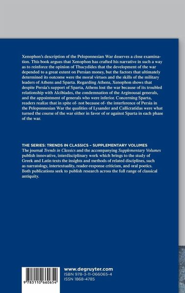 The advances in Xenophontic studies of the last generation have still not resulted in a definitive literary treatment of the Hellenica 1-2, so Xenophon's description of the Peloponnesian War deserves closer examination. This book aims to show that Xenophon has crafted his narrative in such a way as to reinforce the opinion of Thucydides, whose work he continued, that the development of the Peloponnesian War depended to a great extent on Persian money, but the factors that ultimately determined its outcome were the moral virtues and the skills of the military leaders of Athens and Sparta. Regarding Athens, Xenophon wants to show that despite Persia's support of Sparta, Athens lost the war because of its troubled relationship with Alcibiades; the moral disintegration of the Athenians who condemned illegally the Arginousai generals and the appointment of generals who were greatly inferior. Concerning Sparta, Xenophon leads his readers to believe that in spite of- not because of- theinterference of Persia in the Peloponnesian War the moral and military qualities of Lysander and Callicratidas were what turned the course of the war either in favor of or against Sparta in each phase of the war.