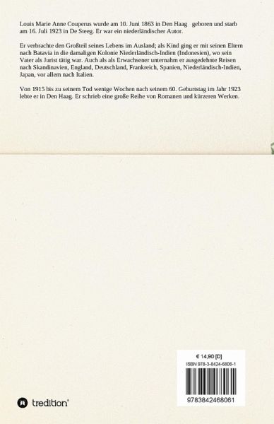 Louis Marie Anne Couperus wurde am 10. Juni 1863 in Den Haag geboren und starb am 16. Juli 1923 in De Steeg. Er war ein niederländischer Autor.Er verbrachte den Großteil seines Lebens im Ausland; als Kind ging er mit seinen Eltern nach Batavia in die damaligen Kolonie Niederländisch-Indien (Indonesien), wo sein Vater als Jurist tätig war.Auch als als Erwachsener unternahm er ausgedehnte Reisen nach Skandinavien, England, Deutschland, Frankreich, Spanien, Niederländisch-Indien, Japan, vor allem nach Italien.Von 1915 bis zu seinem Tod wenige Wochen nach seinem 60. Geburtstag im Jahr 1923 lebte er in Den Haag. Er schrieb eine große Reihe von Romanen und kürzeren Werken.